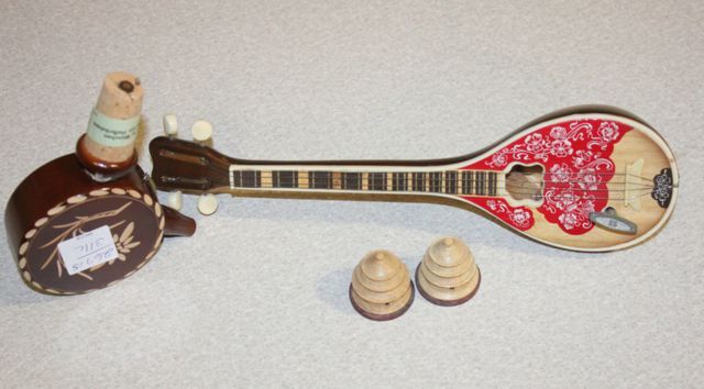 267 Handpainted Music Box Instrument, German Music Box Cork, Carved Head Plaque, and Two Carved Pagoda's