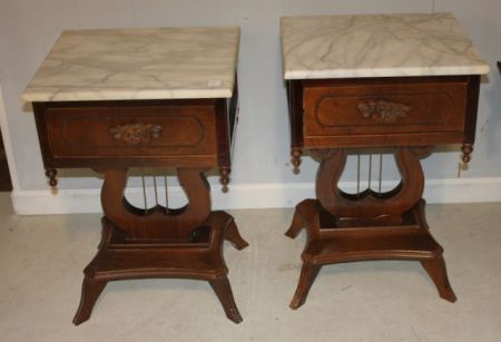 Pair of Duncan Phyfe Style Marble Top Tables with one drawer, 17"w., 15"d., 26"h. Pair of Duncan Phyfe Style Marble Top Tables with one drawer, 17"w., 15"d., 26"h.