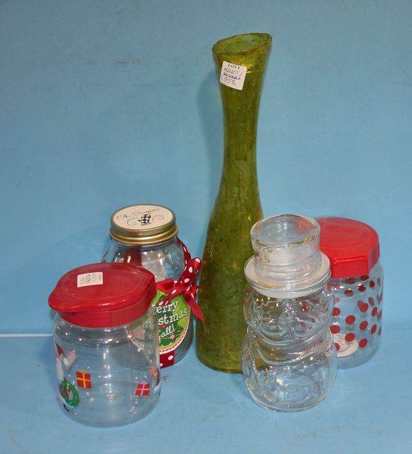 428 Glass Vase and Jars Four Christmas jars and plastic green 60's vase, 14"h.