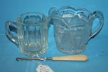 445 Celluloid Vintage Button Hook and Two Small Glass Pitchers