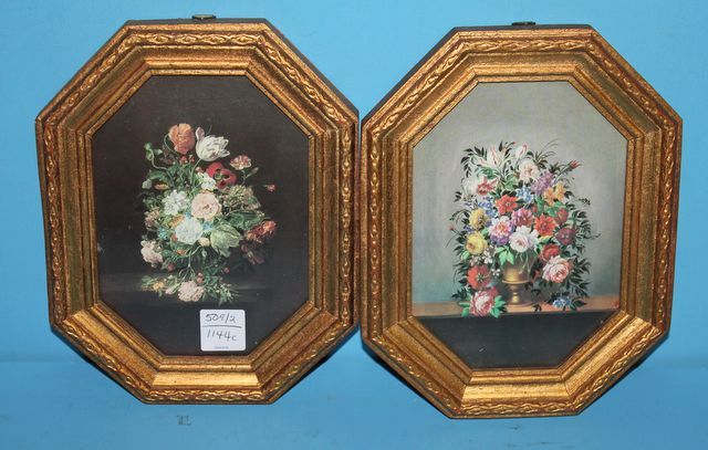 Small Pair of Octagon Shaped Floral Prints 7"w., 9"h. Small Pair of Octagon Shaped Floral Prints 7"w., 9"h.
