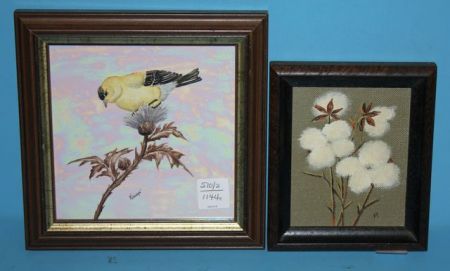 Small Oil Painting of Cotton Balls 5"w., 5"h. and Painted Bird in Limb on Porcelain 7"sq. Small Oil Painting of Cotton Balls 5"w., 5"h. and Painted Bird in Limb on Porcelain 7"sq.