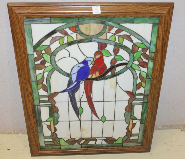 Multi Colored Stained Glass Window with Parrots, 21"w., 27"h. Multi Colored Stained Glass Window with Parrots, 21"w., 27"h.