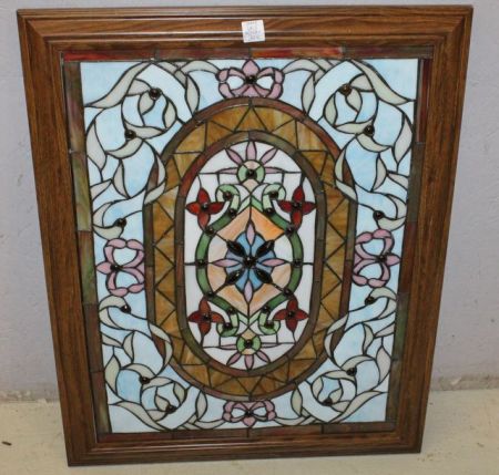 Light Blue and Multi Colored Stained Glass Window with Jewels, 21"w., 27"h. Light Blue and Multi Colored Stained Glass Window with Jewels, 21"w., 27"h.