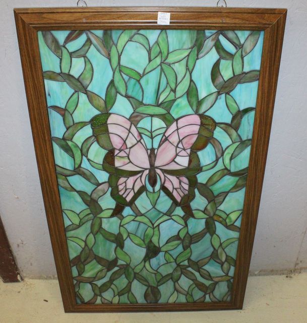Blue and Green Stained Glass Window with Butterfly, 23"w., 37"h. Blue and Green Stained Glass Window with Butterfly, 23"w., 37"h.