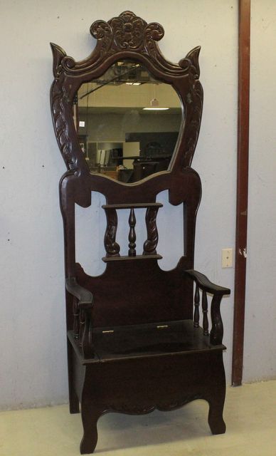 Mahogany Carved Hall Seat with Mirror and Lift Up Seat Mahogany Carved Hall Seat with Mirror and Lift Up Seat, 33"w., 85"h., 19"d. Mahogany Carved Hall Seat with Mirror and Lift Up Seat Mahogany Carved Hall Seat with Mirror and Lift Up Seat, 33"w., 85"h., 19"d.