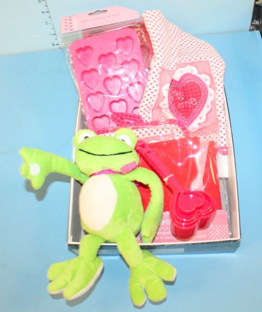 658 Valentine "Happies" Two small ice cube trays in shape of hearts, heart shaped measuring cups, be mine kitchen towel, pot holder, bath pillow and green frog.