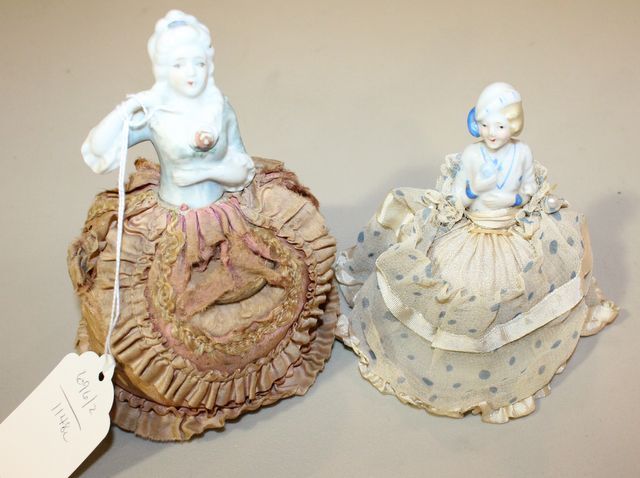 Two Vintage Porcelain Head Pin Cushion Dolls. Two Vintage Porcelain Head Pin Cushion Dolls.