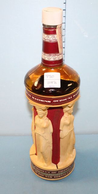 Product of Greece, Ouzounis Distillery, Colored With Caramel, Greek Specialty Liquor Bottle (full) has Grecian plastic figures 13"h. Product of Greece, Ouzounis Distillery, Colored With Caramel, Greek Specialty Liquor Bottle (full) has Grecian plastic figures 13"h.