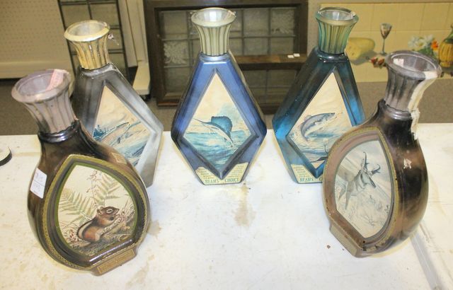 Five Decanters Three fish motif, squirrel, antelope James Lockhart wildlife artist 5"w., 11"w. Five Decanters Three fish motif, squirrel, antelope James Lockhart wildlife artist 5"w., 11"w.