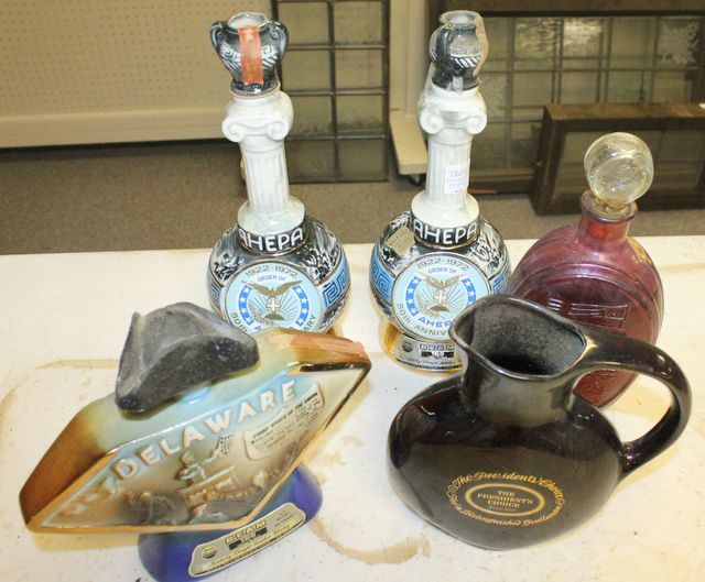 Five Various Decanters Two Ahepa Beam decanters Delaware 7"h., Purple Glass Ezra Brooks 10"h., Presidential Choice 8"h. Five Various Decanters Two Ahepa Beam decanters Delaware 7"h., Purple Glass Ezra Brooks 10"h., Presidential Choice 8"h.