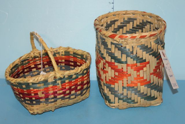799 Two Choctaw Baskets One blue and orange, one blue, orange, and maroon, 7"h., 8"h.