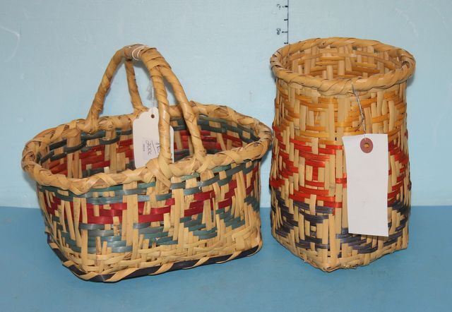 Two Choctaw Baskets One is Yellow, Blue, and Orange, one is blue and Maroon, 8"h., 8"h. Two Choctaw Baskets One is Yellow, Blue, and Orange, one is blue and Maroon, 8"h., 8"h.