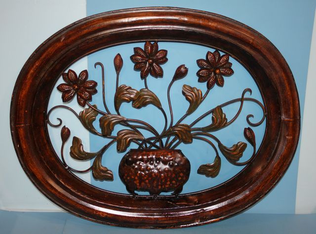 Metal hanging wall art with flower basket design, 28"w., 22"h. Metal hanging wall art with flower basket design, 28"w., 22"h.