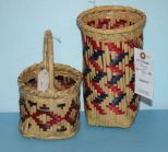 806 Two Choctaw Baskets one black, red, and maroon, one is red and blue, 9"h., 8"h.