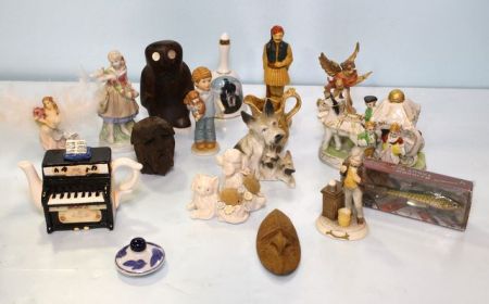 With porcelain figurines, carved owl & trout pen With porcelain figurines, carved owl & trout pen