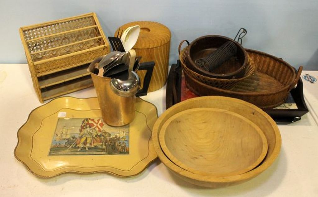 Two wood bowls, trays, ice cooler, aluminum pitcher with utensils Two wood bowls, trays, ice cooler, aluminum pitcher with utensils