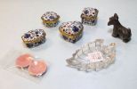 Four blue and white porcelain trinket boxes, 2" grey stone Scottie dog, 4" glass leaf, two small pink ceramic dishes Four blue and white porcelain trinket boxes, 2" grey stone Scottie dog, 4" glass leaf, two small pink ceramic dishes