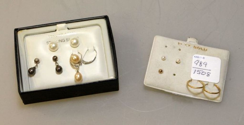 4 pearl studs, 2 gold rings, 1 gold stud (missing 1), 14K gold with pearls, 2 black pearls, 2 ring clasp pearls sterling silver mounts 4 pearl studs, 2 gold rings, 1 gold stud (missing 1), 14K gold with pearls, 2 black pearls, 2 ring clasp pearls sterling silver mounts