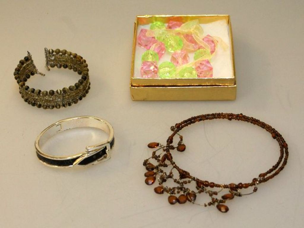 2 pink and green large beads on yellow ribbon, expansion style bracelet antique brown tone beads (3/4" wide), metal 'belt design' bracelet silver and black color, necklace in antique amber stone design 2 pink and green large beads on yellow ribbon, expansion style bracelet antique brown tone beads (3/4" wide), metal 'belt design' bracelet silver and black color, necklace in antique amber stone design
