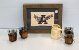 1293 Auburn Mug, Four Cups, and Stitchwork