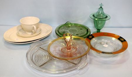 1309 Depression Bowl, Covered Candy, Cake Plate, Two Ceramic Platters, Cup, and Saucer