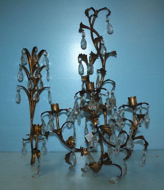 Gold finished with glass prisms; 24" h., and 17" h. Gold finished with glass prisms; 24" h., and 17" h.