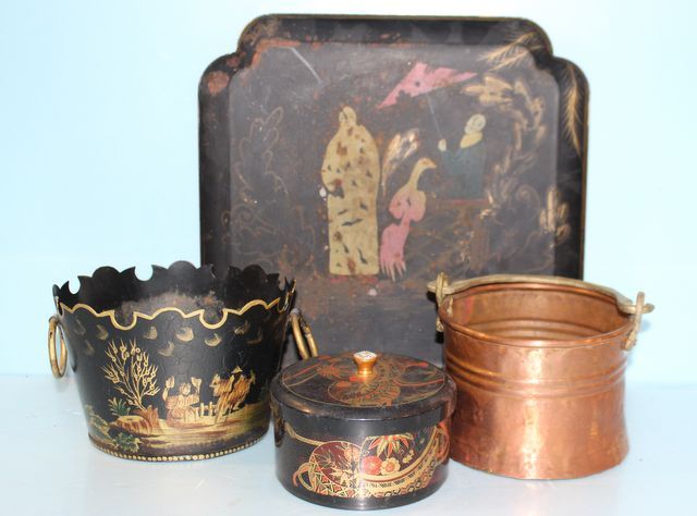 Tray, rust, 12 1/4" square ; oriental planter 7" w. ; oriental box 5" dia. ; copper bucket 6" dia. Tray, rust, 12 1/4" square ; oriental planter 7" w. ; oriental box 5" dia. ; copper bucket 6" dia.