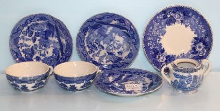 468 Two Miniature Blue and White Cups/ Saucers, Sugar, and Two Saucers