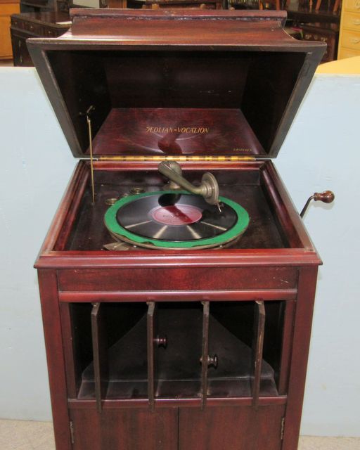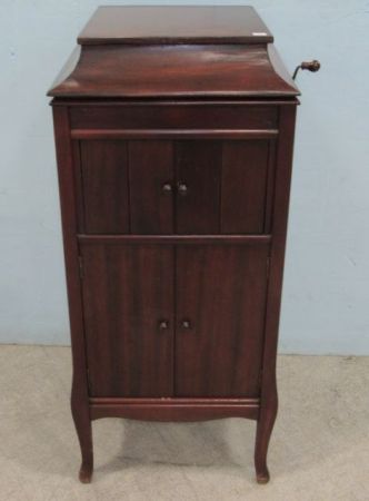 Mahogany, No. 96217, Bridgeport, Conn., has all parts, does work, but needle rod is tight, shell is clean, comes with records, 44"h., 19"w., 22"d. Mahogany, No. 96217, Bridgeport, Conn., has all parts, does work, but needle rod is tight, shell is clean, comes with records, 44"h., 19"w., 22"d.