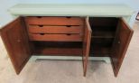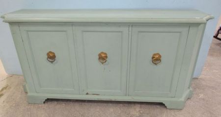 Three door, storage shelf, three drawers, has wear, 32"h., 69"w., 18"d. Three door, storage shelf, three drawers, has wear, 32"h., 69"w., 18"d.