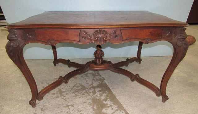 Side pull out table extension with legs, no leaves, cross stretcher with with musical carved man, carved designs on base, parquet top has some small gaps. The piece is in good condition, 29"h., 52"L., 50"w. Side pull out table extension with legs, no leaves, cross stretcher with with musical carved man, carved designs on base, parquet top has some small gaps. The piece is in good condition, 29"h., 52"L., 50"w.