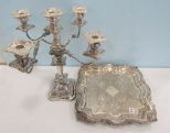 English marked Candelabra five arm 18"h., 17"w., Alvin footed tray 16"sq. English marked Candelabra five arm 18"h., 17"w., Alvin footed tray 16"sq.
