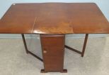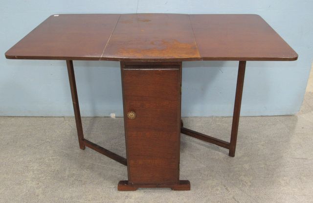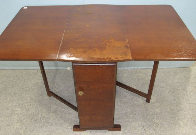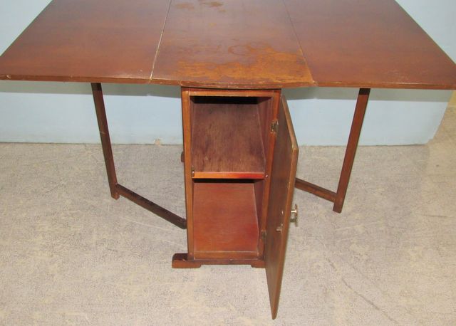 Drop leaf gate leg table, with center pedestal storage with two doors, has veneer wear , 29"h., 47"L., 30"w. Drop leaf gate leg table, with center pedestal storage with two doors, has veneer wear , 29"h., 47"L., 30"w.