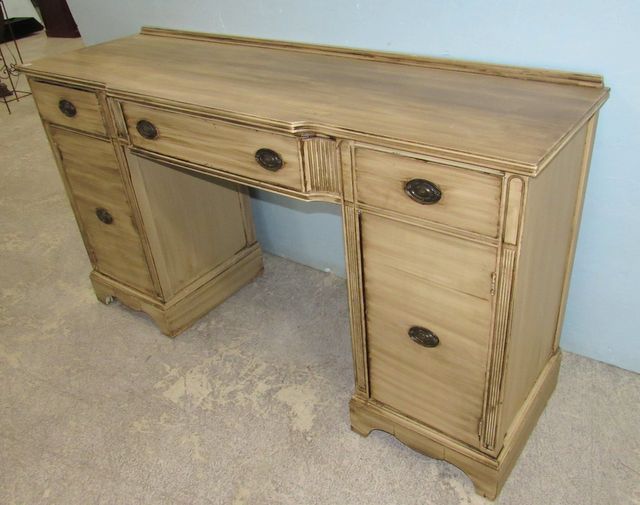 Three drawers, two door storage, hand painted and distressed, 37"h., 64"w., 19"d. Three drawers, two door storage, hand painted and distressed, 37"h., 64"w., 19"d.
