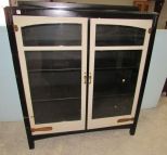 Painted black with white doors, glass doors, brass hinges, three shelves, has paint chips and scratches, 55"h., 48"w., 18"d. Painted black with white doors, glass doors, brass hinges, three shelves, has paint chips and scratches, 55"h., 48"w., 18"d.