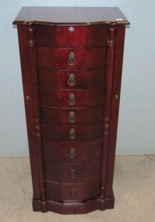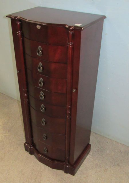 Lift top with mirror, two side panel storage, eight storage drawers, 41"h., 18"w., 11"d. Lift top with mirror, two side panel storage, eight storage drawers, 41"h., 18"w., 11"d.