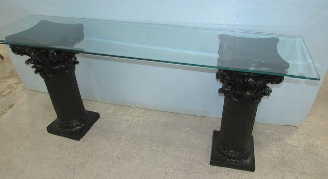 Black resin column pedestals, beveled rectangle glass top, 30"h., 70"w., 18"d. Black resin column pedestals, beveled rectangle glass top, 30"h., 70"w., 18"d.