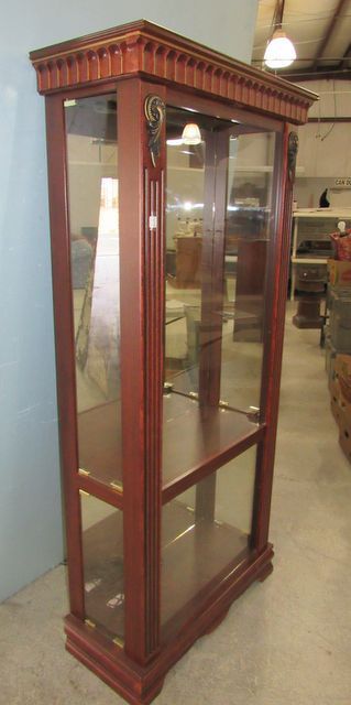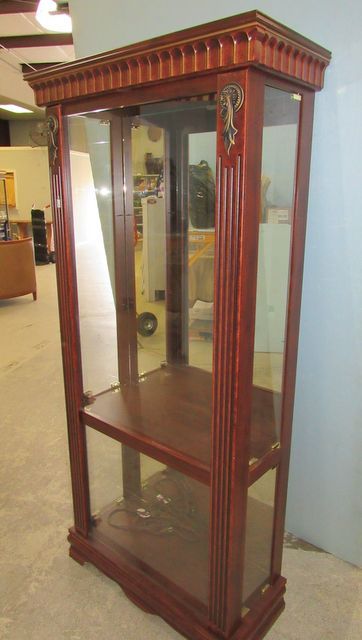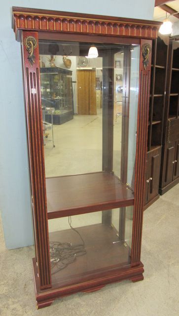 Modern piece, side doors, glass shelves, 73"h., 30"w., 14"d. Modern piece, side doors, glass shelves, 73"h., 30"w., 14"d.