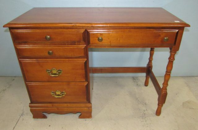 Four drawer, side kneehole, has some finish wear, 30"h., 18"d., 41"w. Includes matching chair (has finish wear) 34"h. Four drawer, side kneehole, has some finish wear, 30"h., 18"d., 41"w. Includes matching chair (has finish wear) 34"h.