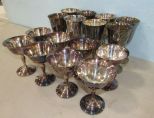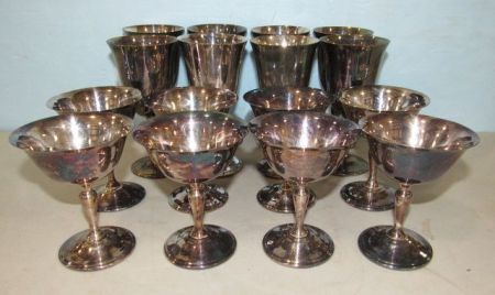 Eight silver plate goblets (tarnished) 6 1/2"h., seven silver plate sherbets, tarnish, 5"h. Eight silver plate goblets (tarnished) 6 1/2"h., seven silver plate sherbets, tarnish, 5"h.