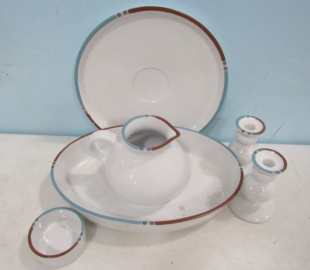 White pitcher 6"h., round underplate 13"dia., pair of candle holders, serving dish 3"h., 15"w. White pitcher 6"h., round underplate 13"dia., pair of candle holders, serving dish 3"h., 15"w.