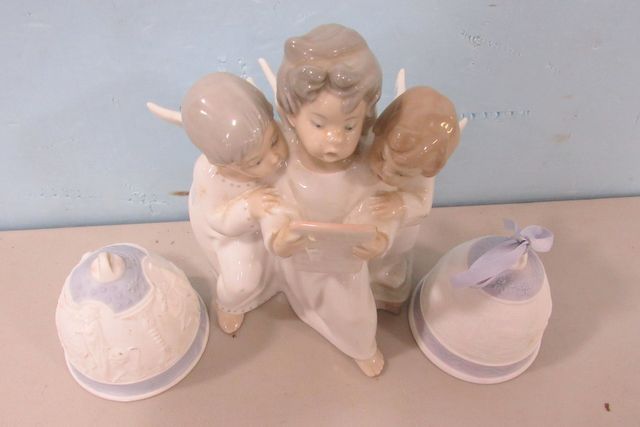 Angels (broken wing) glazed 7"h., two bells 3"h. Angels (broken wing) glazed 7"h., two bells 3"h.