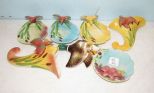 Four hand painted ashtrays 5"L., three hand painted wall pocket 6"h. Four hand painted ashtrays 5"L., three hand painted wall pocket 6"h.