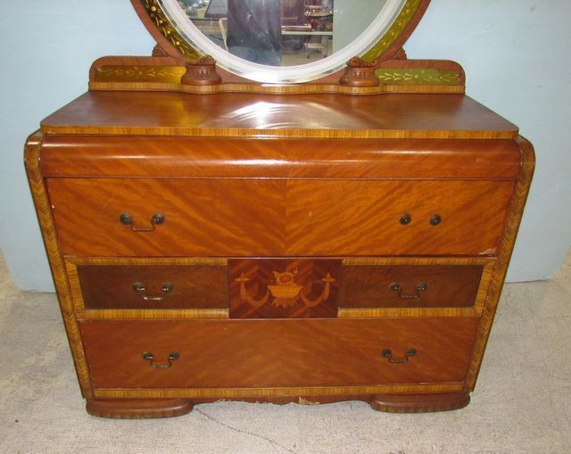 Etched round mirror (has veneer trim missing), has the pull in drawer, 36"h., 48"w. Etched round mirror (has veneer trim missing), has the pull in drawer, 36"h., 48"w.