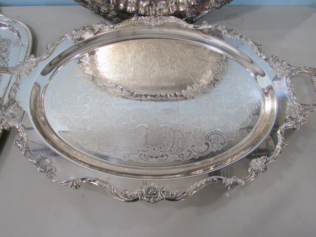 Wallace "Royal Rose" Ornate monogrammed handled footed tray 28"h., 18"w., Crown mark round grapevine silver plate tray 22"dia., English Silver Plate handled tray 27"h.,16"w. Wallace "Royal Rose" Ornate monogrammed handled footed tray 28"h., 18"w., Crown mark round grapevine silver plate tray 22"dia., English Silver Plate handled tray 27"h.,16"w.