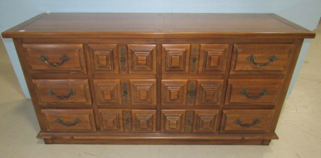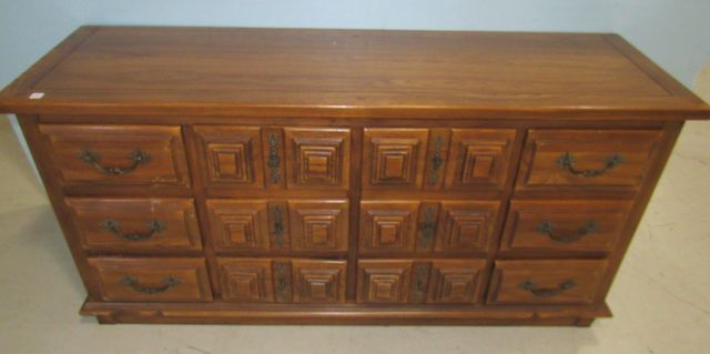 With mirror, glass top, twelve drawers, 32"h., 66"w., 20"d. With mirror, glass top, twelve drawers, 32"h., 66"w., 20"d.