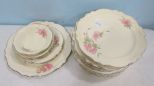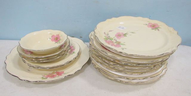 Eight salad plates, three saucers (one has crack), two dessert plates, one dinner plate, bowl. Eight salad plates, three saucers (one has crack), two dessert plates, one dinner plate, bowl.