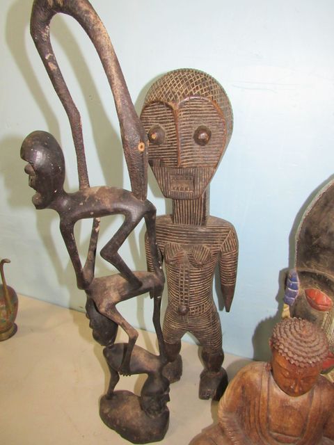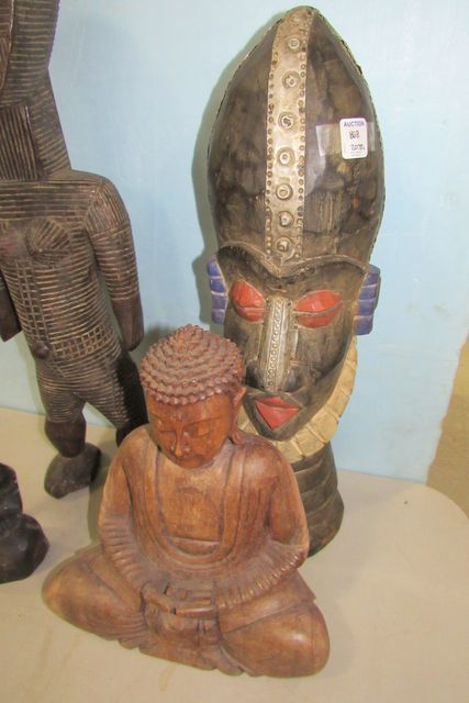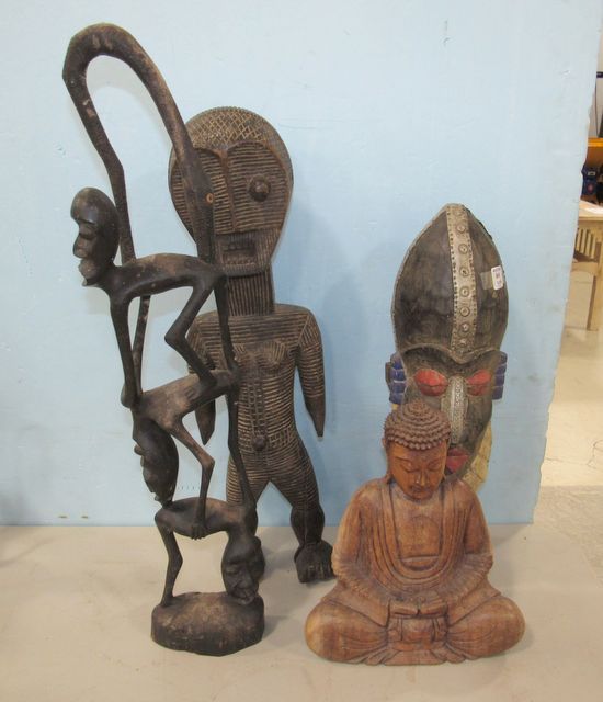 African carved tribal figure (has crack) 24"h., Tribal carved unusual statue (has crack) 26"h., Carved Tribal Mask statue 20"h., wood carved Buddha 11"h. African carved tribal figure (has crack) 24"h., Tribal carved unusual statue (has crack) 26"h., Carved Tribal Mask statue 20"h., wood carved Buddha 11"h.