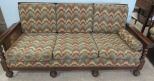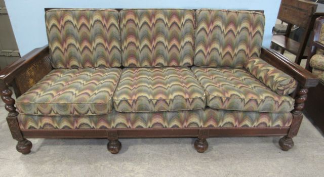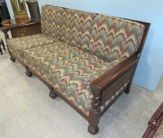 Upholstered cushions, cane back and side panels, barely twist arm designs, bun feet, has finish wear 79"w., 34"h., 35"d. Upholstered cushions, cane back and side panels, barely twist arm designs, bun feet, has finish wear 79"w., 34"h., 35"d.